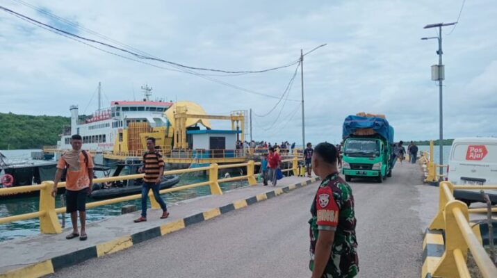 Rote Ndao – Personel Piket Koramil 1627-02/Pantai Baru, Kopda Grani Fia, melaksanakan kegiatan pemantauan bongkar muat penumpang, kendaraan, dan barang di Pelabuhan ASDP Ofalangga,
