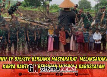DOMPU – Batalyon Infanteri Teritorial Pembangunan 875/Sangga Yudha Perkasa melaksanakan kegiatan karya bakti pembangunan Mushola Darussalam bersama masyarakat Dusun Tanjung Pasir, Desa Calabai, Keca...