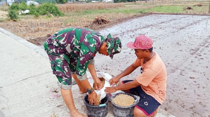 Babinsa 1608-03/Sape bersama petani Laksanakan Tabur Benih di Desa Naru Barat