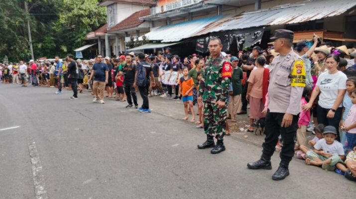 Babinsa Desa Sibetan Serka Nyoman Darmada melaksanakan pengamanan kegiatan lomba gerak jalan jenaka/lucu rangkaian peringatan hari jadi Desa Sibetan ke-325 tahun 2025, di Bajar Dinas Kalanganyar Desa Sibetan Kec. Bebandem Kab.Karangasem, pada Rabu (18/06/25).