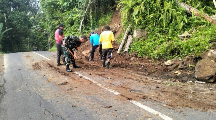 Kami melanjutkan pembersihan sisa tumpukan material longsor yang terdiri dari bebatuan yang cukup besar serta sisa akar pohon tumbang yang masih menutupi hampir sebagain ruas jalan, ungkap Babinsa.