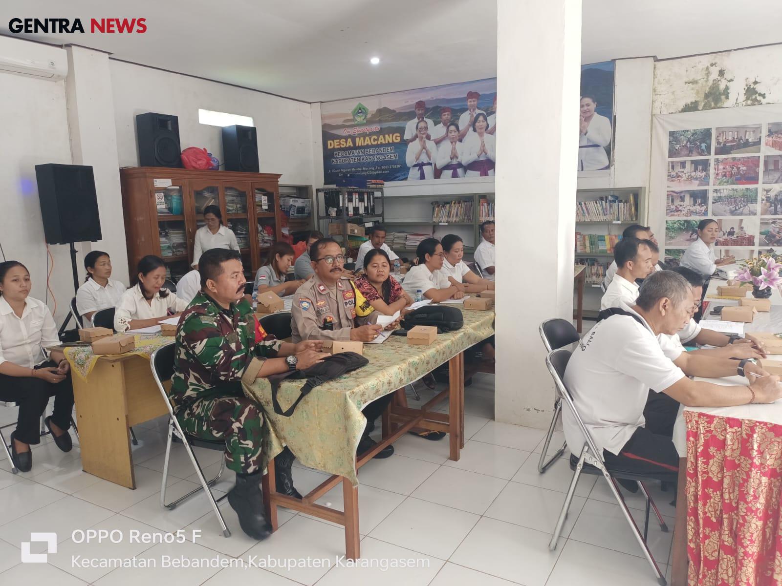 Gentra News Bali – Babinsa Desa Macang Koramil 1623-07/Bebandem Pelda I Gede Bagia Oka Mahendra menghadiri rapat Musrenbangdes tahun 2025 Desa Macang dalam rangka mencermati perencanaan penggunaan Dana Desa tahun 2025 dalam membangun prasarana Desa di Aula Kantor Desa Macang, Kec. Bebandem, Kab. Karangasem, pada Kamis (05/09/24).