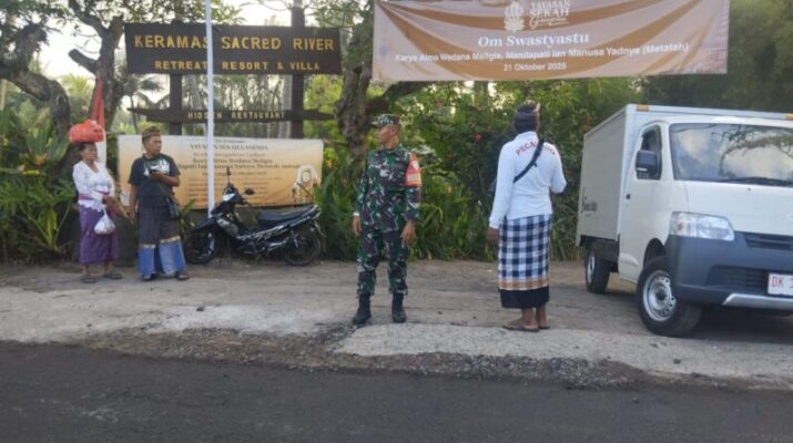 Gianyar – Keramas, Sabtu (18/10/2025) Dalam rangka mendukung kelancaran pelaksanaan kegiatan keagamaan masyarakat, Babinsa Koramil 1616-04/Blahbatuh Sertu Nyoman Lancar bersama Pecalang Desa Adat Keramas melaksanakan pengamanan dan pengaturan arus lalu lintas dalam upacara adat Malegia Manilepati Manusa Yadnya Ngedetin yang dipusatkan di Yayasan Sekah Ganesha, Jalan Selukat, Desa Keramas, Kecamatan Blahbatuh, Kabupaten Gianyar. Kegiatan ini merupakan salah satu tradisi keagamaan umat Hindu yang dilaksanakan secara turun-temurun oleh masyarakat setempat.