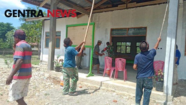 Gentra News NTT – KODIM 1605/BELU, Babinsa Desa Umaklaran Koramil 1605-07/Wedomu Serda Hironimus Kono bersama Kepala Desa dan perangkat desa melaksanakan kegiatan gotong royong pengecatan Aula Kantor Desa Umaklaran, Kecamatan Tasifeto Timur, Kabupaten Belu, Sabtu (23/11/2024).