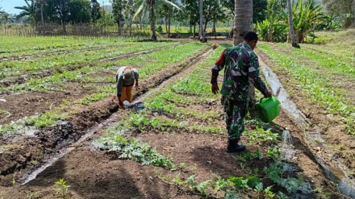 NTT— Alor —, Dalam rangka mendukung ketahanan pangan masyarakat, Babinsa Desa Tanglapui Timur, Serka Tobias Madde, melaksanakan kegiatan bakti membantu warga di wilayah binaannya. Pada Jumat, 19 September 2025 pukul 09.00 Wita, Babinsa turun langsung ke lahan bedengan milik Ibu Maria di Desa Air Mancur, Kecamatan Alor Timur Laut, untuk membantu menyiram tanaman sayur dan semangka yang sudah tumbuh besar.