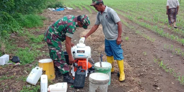 Gentra.co.id NTT – Sumbawa Barat, Babinsa Desa Tambak Sari Koramil 1628-04/Poto tano Koptu Zainal Arifin laksanakan pendampingan petani jagung kegiatan penyemprotan di lahan Pak I Nengah seluas 3 Ha..