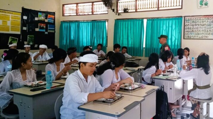 BALI – Denpasar, Babinsa Kelurahan Sumerta, Sertu Ketut Lopi, melakukan pengawalan dan pengawasan dalam kegiatan Running/Launching Makan Bergizi Gratis Nasional tahun 2025 di SMP Negeri 8 Denpasar. Kegiatan ini berlangsung di SMP Negeri 8 Denpasar, Jalan Meduri, Banjar Abian Kapas Kaja, Kelurahan Sumerta, Kecamatan Denpasar Timur, Kota Denpasar. Senin, (05/05/2025).