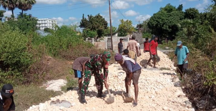 NTT-KUPANG, – Babinsa Kelurahan TDM/Kayu Putih Koramil 1604-01/Kupang, Sersan Kepala Alexander Tanesib, melaksanakan kerja bhakti bersama warga masyarakat dan tenaga kerja dari Dinas Pekerjaan Umum Kota Kupang. Kegiatan ini dilakukan dalam rangka membantu proses perataan agregat C sepanjang kurang lebih 1.023 meter yang nantinya akan diaspal, bertempat di wilayah RT 24 RW 07 Kelurahan TDM, Kecamatan Oebobo, Kota Kupang. Jumat (22/08/2025).