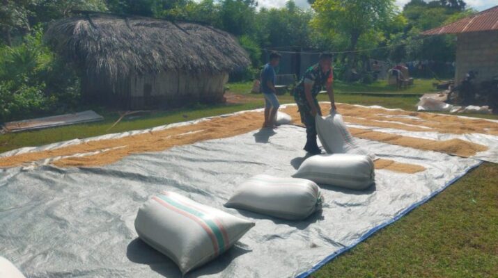 NTT – Sumba Timur,Kepedulian terhadap masyarakat terus ditunjukkan oleh Babinsa Koramil 03/Pahunga Lodu, Kodim 1601/Sumba Timur, Serda Hendrik Hati, ia turun langsung membantu petani menjemur padi di Desa Wulla, Kecamatan Wulla Waijelu, Kabupaten Sumba Timur. Sabtu (17/05/2025).