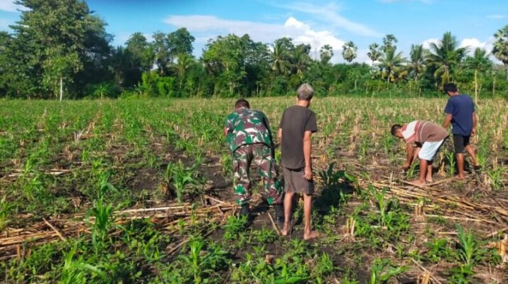 Serda Hendrik Hati Waluandja Babinsa Koramil 03/Pahunga Lodu Kodim 1601/Sumba Timur, melaksanakan pemantauan kondisi tanaman jagung yang terserang hama (ulat pucuk), milik warga binaan Dusun Buddi Hadang, Desa Paranda,Kecamatan Wulla Waijelu, Kabupaten Sumba Timur Senin (05/05/2025).