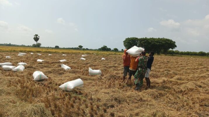 NTT – Sumba Timur, Serka Daniel Umbu Ndawa Babinsa Koramil 03/Pahunga Lodu, Kodim 1601/Sumba Timur membantu warga mengangkat hasil panen padi milik warga binaan Desa Kaliuda, Kecamatan Pahunga Lodu, Kabupaten Sumba Timur, Rabu (21/05/2025)