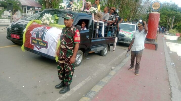 Ende, NTT – Babinsa dari Koramil 1602-01/Ende turut andil dalam pengamanan kegiatan pawai pelepasan tim sepak bola Kabupaten Ende yang akan mengikuti turnamen Piala Bupati Cup Ende. Kegiatan berlangsung dengan meriah di Jl. Soekarno hingga Lapangan Pancasila, Kelurahan Kota Raja, Kecamatan Ende Utara, Jumat (11/7/2025).
