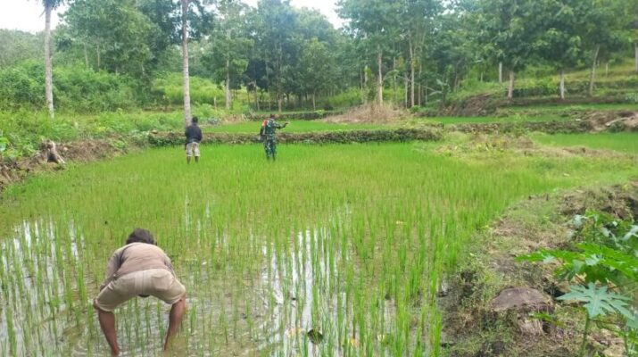 SUMBA BARAT – Dalam rangka mendukung program ketahanan pangan dan meningkatkan hasil pertanian warga, anggota Koramil 1613-01/Loli, Serka Frengki Moni yang menjabat sebagai Babinsa Kelurahan Diratana, Kecamatan Loli, Kabupaten Sumba Barat, melaksanakan pendampingan kepada para petani yang sedang melakukan pemupukan tanaman padi di area persawahan, Minggu (13/7/2025).