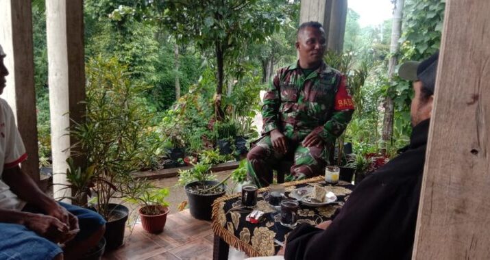 NTT-Kefamenanu, Sabtu 12 Juli 2025, Senyum dan tawa bukan hanya tanda bahagia bagi Masyarakat, tapi jembatan kehangatan yang menyatukan makna, Dalam upaya menjaga kedekatan dengan masyarakat dan memperkuat komunikasi sosial (komsos), Serda Hendrikus G Patty Babinsa Koramil 1618-02/Miobar, melaksanakan kegiatan anjangsana ke rumah salah satu warga binaannya, Bapak Matias Kenjang di Desa Sallu, Kec. Miomafo Barat, Kab. TTU.