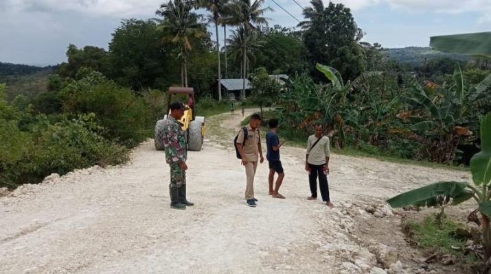 Gentra.co.id NTT – Babinsa Koramil 1621-01/Kota So’e Serda Nyongsri Faot Monitoring Pengerasan Jalan Bersama TPK Di Dusun A Desa Enoneontes Kecamatan