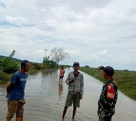 Menanggapi kondisi tersebut, Babinsa Koramil 1621-05/Panite Serda Basuki langsung turun ke lokasi guna memantau situasi sekaligus memastikan keselamatan warga dan pengguna jalan. Ketinggian air yang mencapai 20-40 cm menyebabkan arus lalu lintas tersendat dan membahayakan kendaraan, terutama kendaraan roda dua dan mobil kecil.