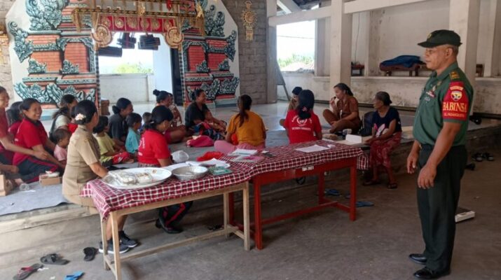 Gentra.co.id –Babinsa Koramil 1623-01/Karangasem Kelurahan Padangkerta Peltu I Wayan Sumadra melaksanakan pendampingan petugas kesehatan melaksanakan Posyandu Balita di Balai Banjar Lingk ungan Dausa, Kel. Padangkerta, Kec/Kab Karangasem pada Senin (5/05/2025)