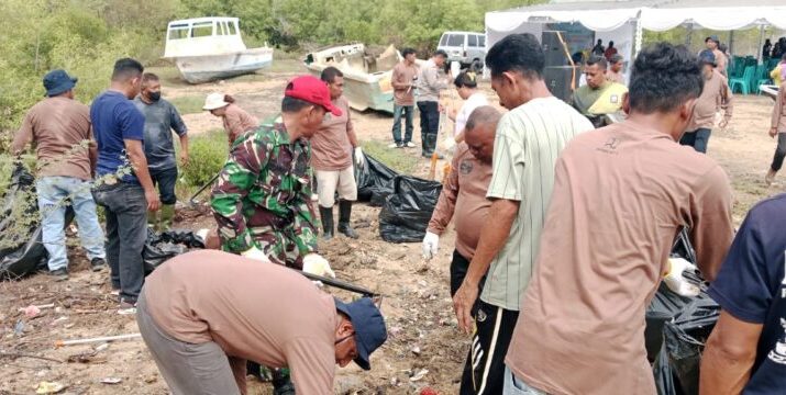 NTT-KUPANG, – Babinsa Kelurahan Oesapa Barat Koramil 1604-01/Kupang, Peltu Tomi J. Kurumbatu, bersama pemerintah Kota Kupang dan tim dari Kementerian PUPR serta Balai Wilayah Sungai, melaksanakan kegiatan karya bakti pembersihan pantai muara sungai di RT 007/RW 03, Kelurahan Oesapa Barat, Kecamatan Kelapa Lima, Kota Kupang. Kegiatan ini bertujuan untuk menjaga kebersihan lingkungan sekaligus mengantisipasi terjadinya banjir akibat penumpukan sampah di area muara sungai. minggu (12/10/2025).
