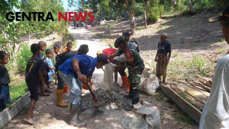 Gentra News Soe – Upaya menumbuhkan semangat Gotong royong, Babinsa Kota Soe Serda Agus Takesan bersama warga Masyarakat Desa Noemeto melaksanakan Kegiatan karya bakti pengecoran jalan Rabat beton Menuju SDI OENIUPSAE Anggaran Dari Dana Desa Tahun 2024 Di Dusun 2 Desa Noemeto Kecamatan Kota Soe Kabupaten TTS