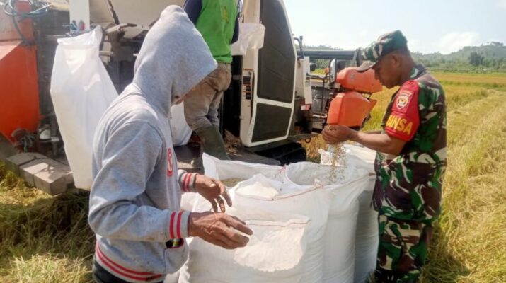 Dalam rangka mendukung program ketahanan pangan nasional, Anggota Posramil Parado Koramil 1608-07/Monta melaksanakan kegiatan pendampingan sekaligus membantu warga dalam panen padi di Desa Parado Rato, Kecamatan Parado, Kabupaten Bima.