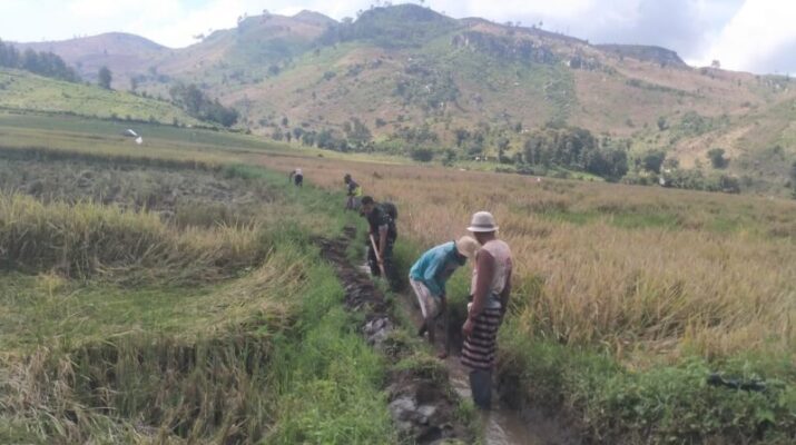 Gentra.co.id –Dompu-NTB. Babinsa Desa Manggeasi, Pelda Suratman Koramil 1614-01/Dompu, melaksanakan kegiatan bersama petani dengan membangun saluran irigasi di area persawahan Desa Manggeasi, Kecamatan Dompu, Kabupaten Dompu. Sabtu (03/05/2025).
