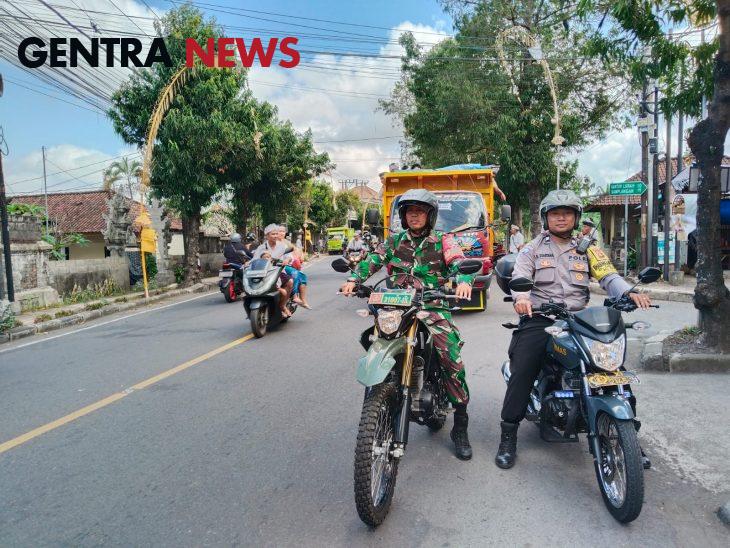 Gentra News Bali – Gianyar – Samplangan, Babinsa Kelurahan Samplangan Koramil 1616-01/Gianyar Sertu I Komang Yudiartana bersama Bhabinkamtibmas Aiptu Ida Bagus Made Suartana berkolaborasi dengan Pecalang Desa adat Samplangan melaksanakan kegiatan pengamanan dan Pengawalan kegiatan Upacara Adat melasti/Mekiyis eedan/rangkaian Karya Mamungkah, Mupuk Pedagingan, Padudusan Agung di Pura Dalem Koripan Desa adat Samplangan. Sabtu (27/7/2024)