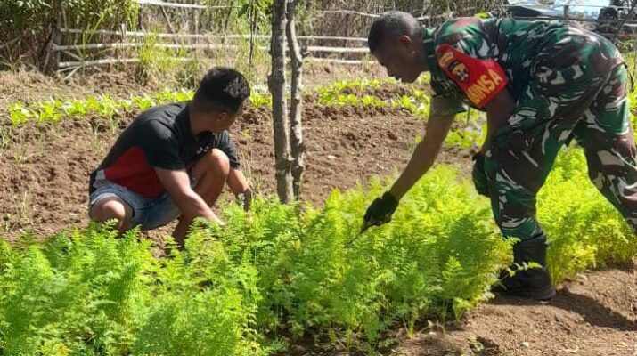 NTT-Kefamenanu, Sabtu 23 Agustus 2025, Sikap kepedulian antar sesama menjadi bukti nyata bahwa kehadiran TNI di tengah Masyarakat bukan sekadar menjalankan tugas, melainkan membangun jalinan hati dan kebersamaan dalam setiap langkah kehidupan, mendukung ketahanan pangan dan meningkatkan hasil pertanian Masyarakat, Babinsa Koramil 1618-02/Miomaffo Barat, Serda Elias Punef, melaksanakan kegiatan pendampingan kepada petani sayur di Desa Fatuneno, Kecamatan Miomaffo Barat, Kabupaten Timor Tengah Utara (TTU).