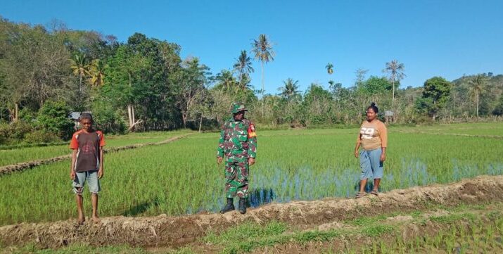 NTT – Sumba Timur. Sertu Ejiman Babinsa Koramil 04/Tabundung , Kodim 1601/Sumba Timur aktif dampingi petani untuk memeriksa pertumbuhan padi di sawah milik warga binaan Desa Praingkareha, Kecamatan Tabundung, Kabupaten Sumba Timur. Sabtu (09/08/2025).
