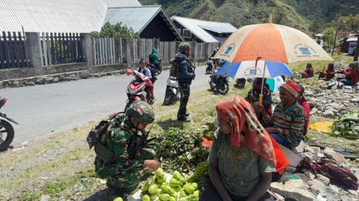 Puncak Jaya, Papua — Suasana penuh kehangatan dan sukacita terasa di Pasar Mulia, Kabupaten Puncak Jaya, Sabtu (23/08/25), ketika Prajurit Satgas Yonif 743/PSY melaksanakan program Belanja Kasih dengan membeli hasil bumi dari mama-mama Papua.