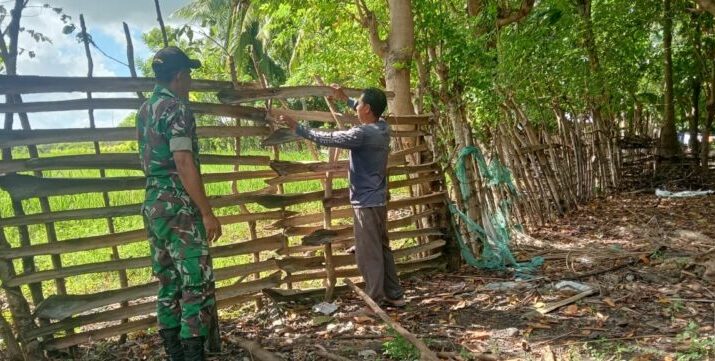 NTT- Rote Ndao – Babinsa Koramil 03/Batutua Kodim 1627/Rote Ndao, Praka Sutrisno bantu warga binaan Bapak Bernadus perbaikan pagar sawah agar hewan tidak masuk,berlokasi di Desa Oerefu Kecamatan Rote Barat Daya Kabupaten Rote Ndao,Senin, (5/05/25)