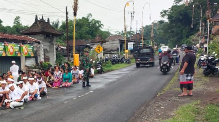 Bangli – Babinsa Desa Kayubihi, Koramil 01/Bangli, Kodim 1626/Bangli, Serka I Wayan Suastika, bersama Pecalang Banjar Adat Gebagan melaksanakan pemantauan sekaligus pengamanan prosesi upacara adat Mecaru Ke Enem yang berlangsung di perempatan Banjar Gebagan, Desa Adat Kayubihi, Kecamatan/Kabupaten Bangli. Minggu (14/12/25).