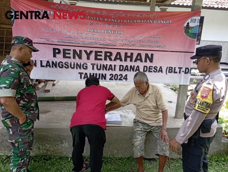 Menjaga situasi kamtibmas diwilayah desa binaannya tetap kondusif, Bhabinkamtibmas Desa Bunutin Polsek Bangli Bripka I Nengah Padmayasa bersinergi dengan Babinsa Peltu I Ketut Udayana Pantau pelaksanaan pembagian/penyaluran BLT (bantuan langsung tunai) tahap XI tahun 2024, yang bersumber dari DD (Dana Desa) di Banjar Selati, Desa Bunutin Kec./Kab.Bangli. Jumat pagi (15/11/2024).