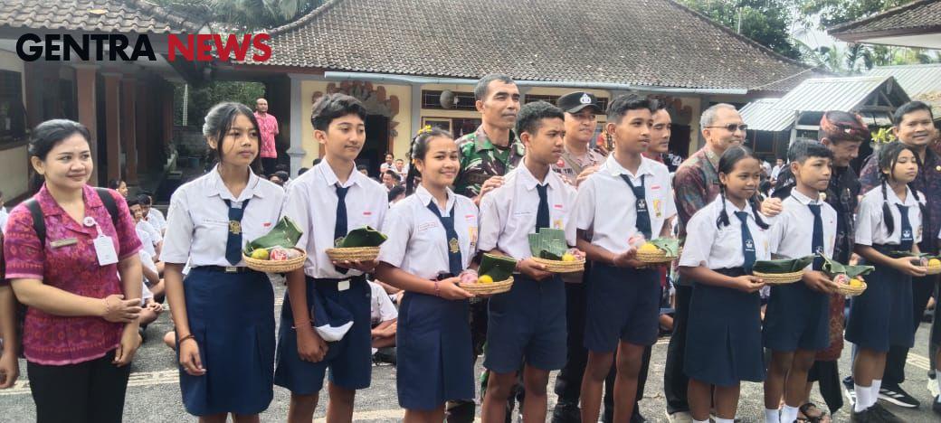 Gentra News Bali – Polres Karangasem-Polsek Abang-Pada hari Selasa tgl 30 Juli 2024 pukul 08.00 wita bertempat di Lapangan SMP N 5 Abang, Banjar dinas Bau Kawan, Desa Nawa kerti, kecamatan Abang Bhabinkamtibmas Desa Nawa kerti Aipda I Komang Tri Maindra Yuda SH bersama Babinsa Desa Nawa kerti Serda I Wayan Budi Swastika menghadiri undangan Kegiatan promosi dan sosialisasi Goes to Sohool dengan memberikan pengetahuan serta memberikan contoh bagaimana mengkonsumsi makanan B2SA ( beragam, bergizi seimbang dan aman) melalui kegiatan pemberian makanan B2SA Kepada Anak anak SMP N 5 Abang.