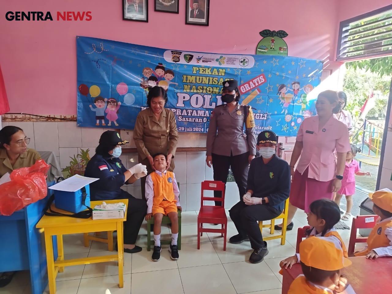 Dalam rangka Pekan Imunisasi Nasional Polio (PIN POLIO) Bhabinkamtibmas Aipda Putu Eka Kristina, monitoring dan pendampingan kegiatan Pekan Imunisasi Polio (PIN Polio) di TK Kemala Bhayangkari 06 Bangli, Kelurahan Kawan, Kec./Kab. Bangli, Senin (12/8/2024).