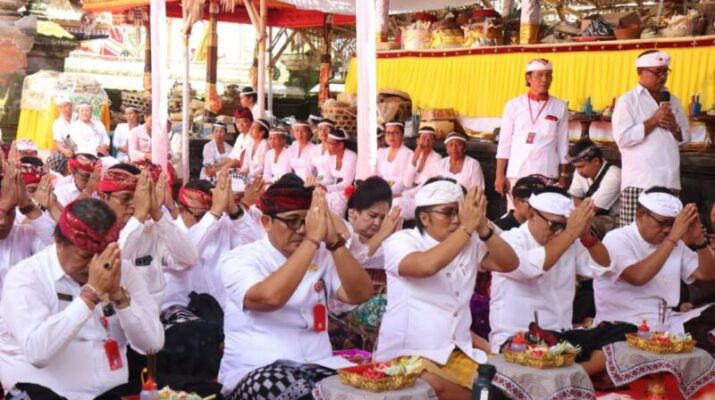 Tabanan PR – Bupati Tabanan, Dr. I Komang Gede Sanjaya, S.E., M.M., bersama Wakil Gubernur Bali, I Nyoman Giri Prastas, menghadiri Uleman Upacara Pemelaspasan Kantor Desa Kesiut, Kecamatan Kerambitan, Tabanan, Uleman Ngupasaksi dalam rangkaian Karya Agung Mamungkah, Ngenteg Linggih, Ngusaba Desa, dan Tawur Balik Sumpah Agung di Pura Desa, Desa Adat Wanasari, Tabanan, Rabu (2/4). Acara ini juga dihadiri oleh sejumlah pejabat penting lainnya, termasuk anggota DPRD Bali, Wakil Bupati Tabanan dan anggota DPRD Kabupaten Tabanan, Sekda Tabanan serta para perangkat daerah terkait di lingkungan Pemkab Tabanan.