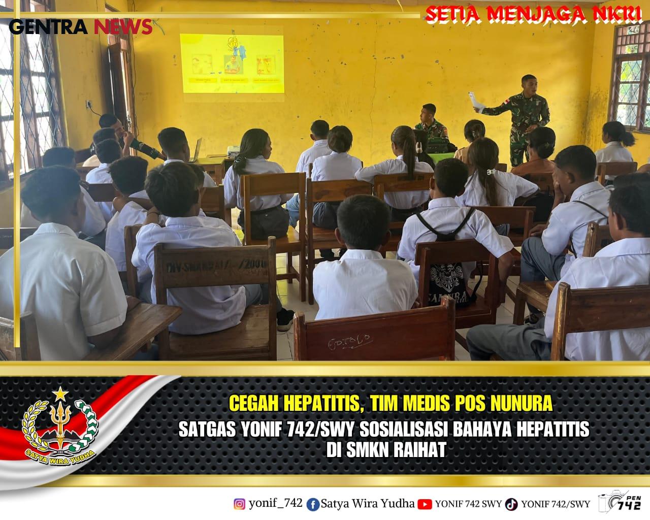 Gentra News NTT – Belu, Pos Nunura Kipam I, Satgas Yonif 742/SWY memberikan penyuluhan penyakit Hepatitis terhadap Murid SMK N Raihat di Desa Tohe Kec. Raihat, Kab. Belu. Kegiatan penyuluhan yang diberikan oleh Tim Medis Satgas Yonif 742/SWY dalam rangka memperingati Hari Hepatitis Sedunia. Minggu (28/7/2024)
