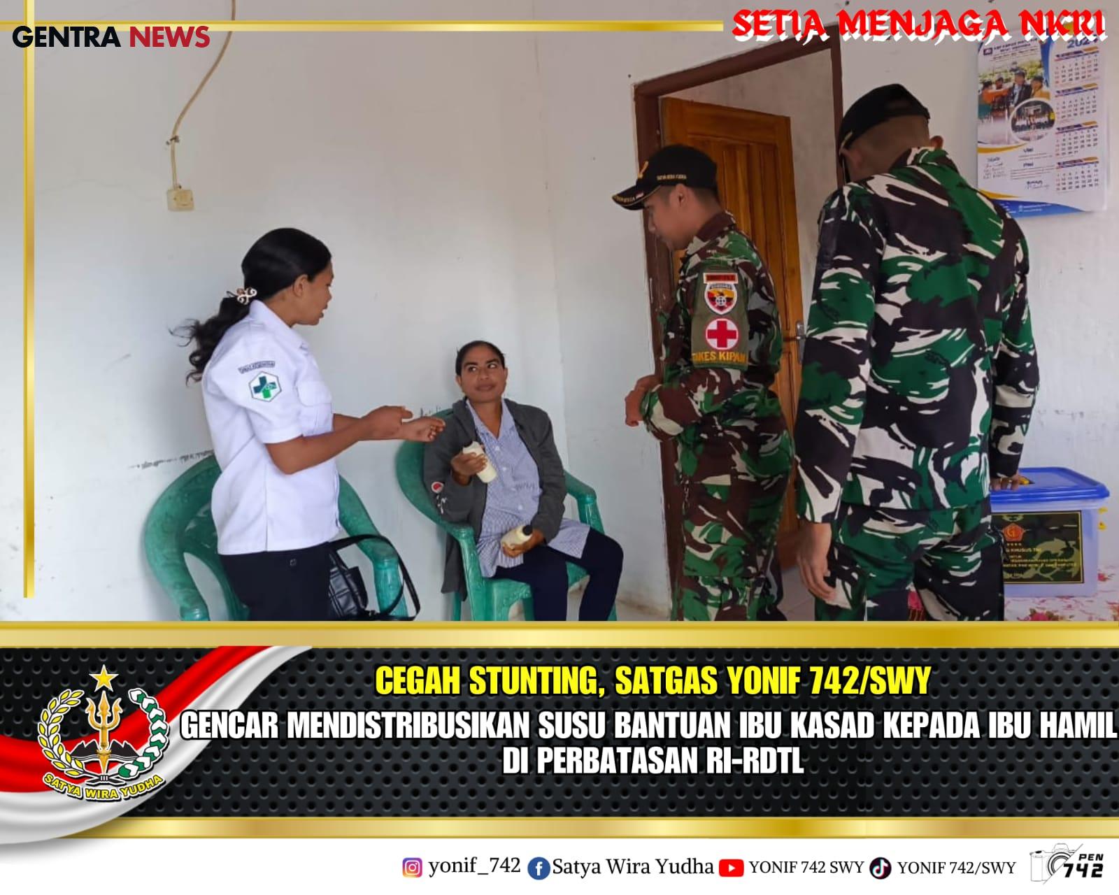 Gentra News NTT – Belu, Mencegah stunting, Satgas Yonif 742/SWY rutin mendistribusikan susu kepada ibu hamil di wilayah perbatasan RI-RDTL. Dukungan susu sapi yang sudah dipasteurisasi tersebut merupakan bantuan dari Ibu Kasad Ny. Paulina Maruli Simanjuntak untuk ibu hamil di perbatasan RI-RDTL. Jumat (23/8/2024)