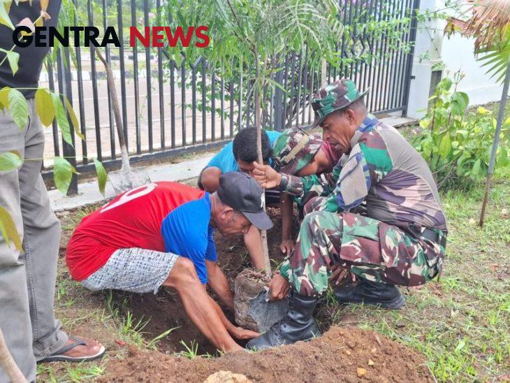 Gentra News NTT – KODIM 1605/BELU, Babinsa Desa Silawan Koramil 1605-07/Wedomu Serma Duarte Dos Santos bersama anggota Satgas Pamtas Yonif 741/GN dan warga melaksanakan kegiatan karya bakti pembersihan lingkungan gereja dan penanaman pohon.