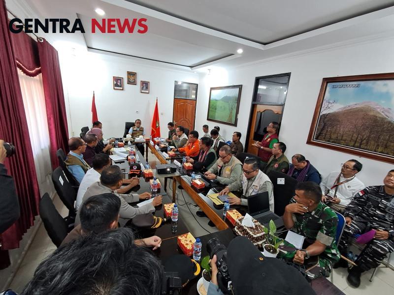 Tiba di Kabupaten Flotim Menteri PMK RI Prof. Dr. Praktikno, M. Soc. Sc. beserta rombongan menuju kantor Bupati Kab. Flotim untuk melaksanakan rapat Kordinasi kemudian meninjau ketersedian logistik untuk masyrakat yang terdampak Erupsi Gunung Lewotobi di Gor Pemkab Flotim.