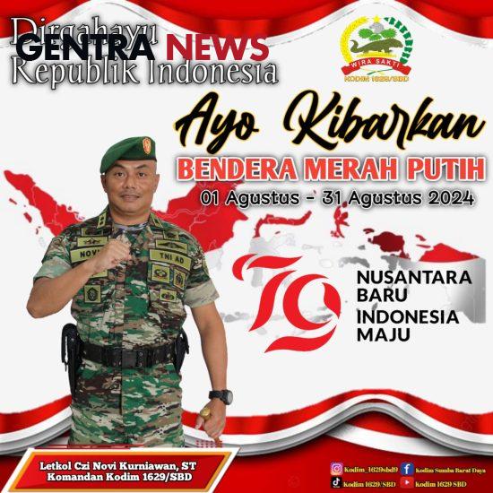 Gentra News NTT-SBD/Dalam rangka memperingati HUT ke-79 Kemerdekaan Republik Indonesia, Dandim 1629/Sumba Barat Daya Letkol Czi Novi Kurniawan, ST., mengajak seluruh elemen masyarakat untuk mengibarkan bendera merah putih selama 1 bulan penuh terhitung sejak tanggal 1 Agustus – 31 Agustus 2024.