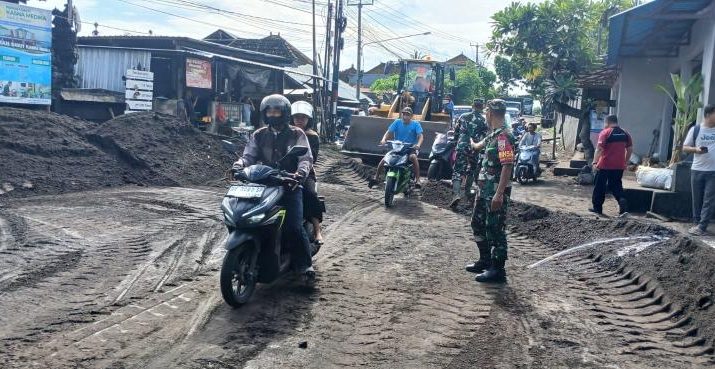 Gentra.co.id Bali – Komandan Koramil (Danramil) 1623-08/Kubu Kapten Inf Made Arjana terjun langsung kelapangan bersama Anggota dan Personil Polsek Kubu melaksanakan pengawalan sekaligus mengatur lalulintas saat pelaksanaan pembersihan Material banjir berupa pasir dan bebatuan yang menumpuk di Jalan Raya, Jumat (3/01/25)