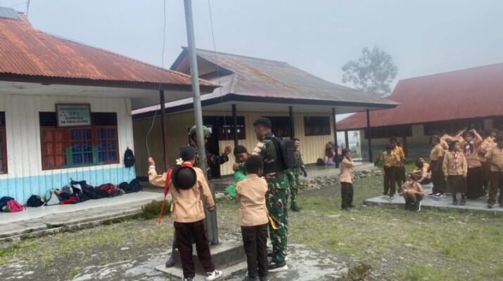 Puncak Jaya, Papua — Dalam menjalankan misi pengabdian di wilayah Papua, Satgas Yonif 743/PSY Pos Usir terus memperkuat pembinaan terhadap generasi muda. para prajurit melaksanakan kegiatan belajar-mengajar, pelatihan upacara bendera, serta penyampaian materi wawasan kebangsaan di SD Mulia, Kabupaten Puncak Jaya. Jumat (17/10/25)