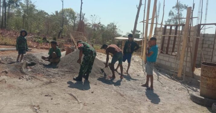 Pembangunan rumah dilakukan secara bergotong royong oleh warga setempat bersama Babinsa, yang turut serta mulai dari pengangkutan material hingga pengerjaan struktur bangunan.