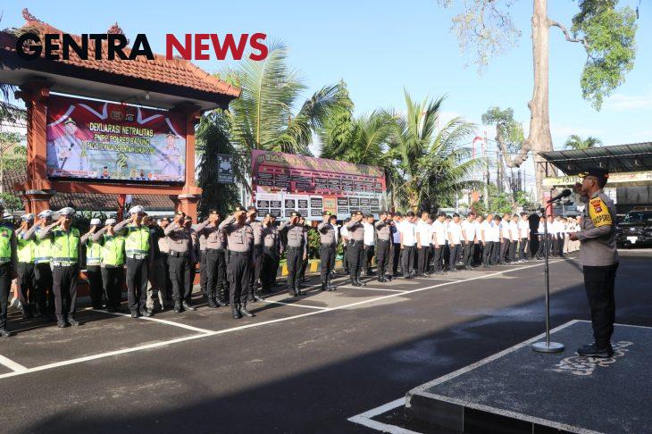 Gentra News Mangupura – Kepala Kepolisian Resor Badung AKBP Teguh Priyo Wasono, SIK. mengajak seluruh PNPP (Pegawai Negeri Pada Polri-red) Polres Badung untuk selalu netralitas dalam pagelaran pesta demokrasi Pemilukada serentak tahun 2024, sebagai bentuk komitmen netralitas Kapolres AKP Teguh Priyo Wasono, SIK deklarasikan netralitas personel Polres Badung pada saat apel jam pimpinan di lapangan apel Jl. Kebo Iwa no. 1 Mengwitani Kecamatan Mengwi Kabupaten Badung, Bali. Senin (29/07/2024) pagi
