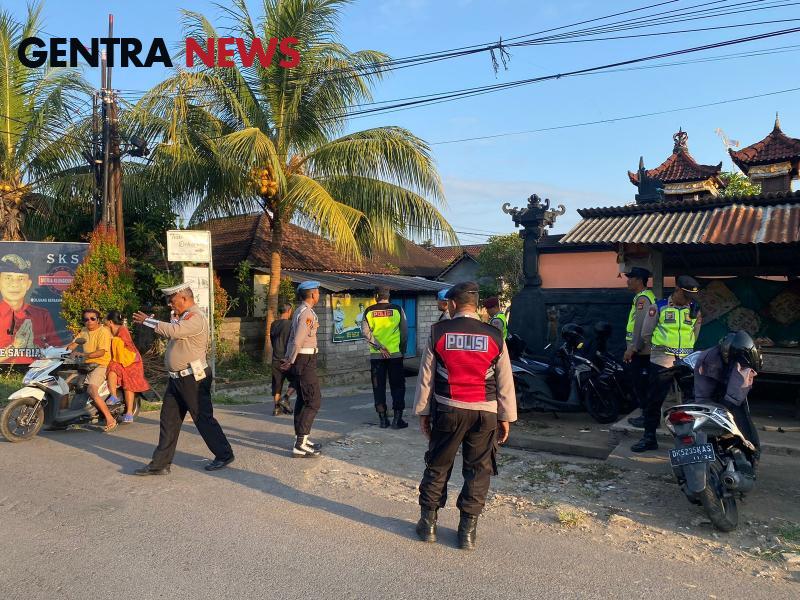 Personel Polres Klungkung yang terlibat dalam Operasi Mantap Praja Agung 2024 melaksanakan pengamanan kegiatan simakrama Cabup Paslon no 2 I Made Satria dengan ketua tim pemenangan I Nyoman Suwirta, di kediaman Jro Pasek Gelgel, Desa Tusan, Banjarangkan, Klungkung, (28/09/2024).
