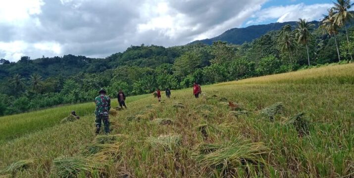 Babinsa Koramil 04/Tabundung, Kodim 1601/Sumba Timur, Sertu Ejiman dengan semangat membantu petani mengangkat dan mengumpulkan padi yang telah dipotong milik Bapak Wulang, warga Desa Praingkareha, Kecamatan Tabundung, Kabupaten Sumba Timur, Jum’at (09/05/2025)