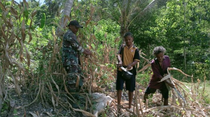 TTS – Babinsa Koramil 02 Abanteng Jajaran Kodim 1621 TTS, Serka Okri Bano membantu petani dalam memanen jagung di lahan milik salah Warga Binaan Imanuel Nautani salah Seorang petani di desa Pana kecamatan Kolbano, kabupaten Timor Tengah Selatan, Selasa (21/04/2025)