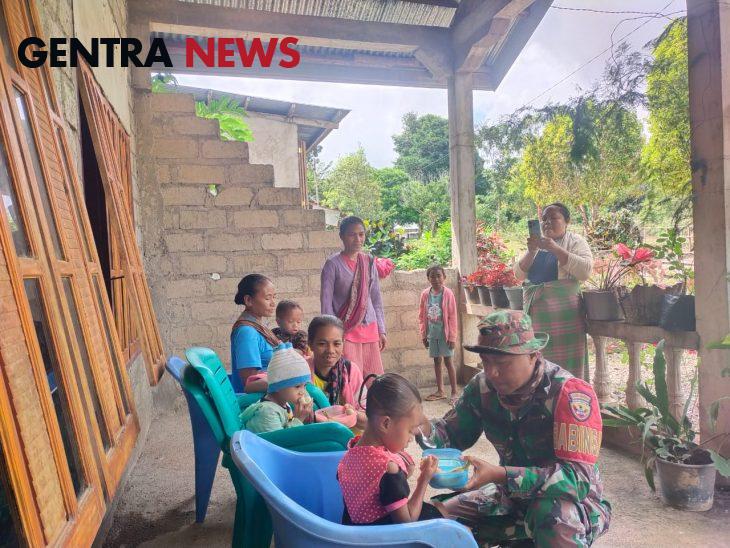 Gentra News NTT – KODIM 1605/BELU, Peduli terhadap kesehatan warga khususnya dalam hal penanganan stunting dan gizi buruk, Babinsa Desa Uabau Koramil 1605-05/Kobalima Serda Paulino Ximenes mendampingi pemberian makanan tambahan (PMT) untuk Balita di wilayah binaannya.