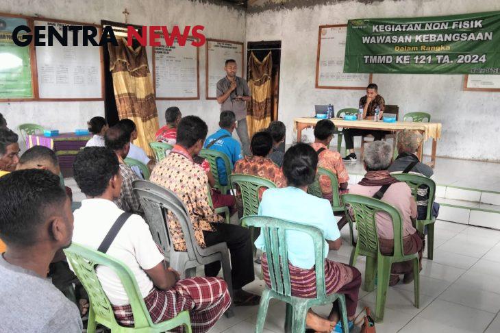 Gentra News NTT – KODIM 1605/BELU, Satgas TMMD ke 121 Kodim 1605/Belu gandeng gandeng Badan Kesatuan Kebangsaan dan Politik (Kesbangpol) Kabupaten Malaka memberikan materi wawasan kebangsaan kepada masyarakat Desa Tniumanu, Kecamatan Laenmanen, Kabupaten Malaka NTT, Senin (29/7/2024).