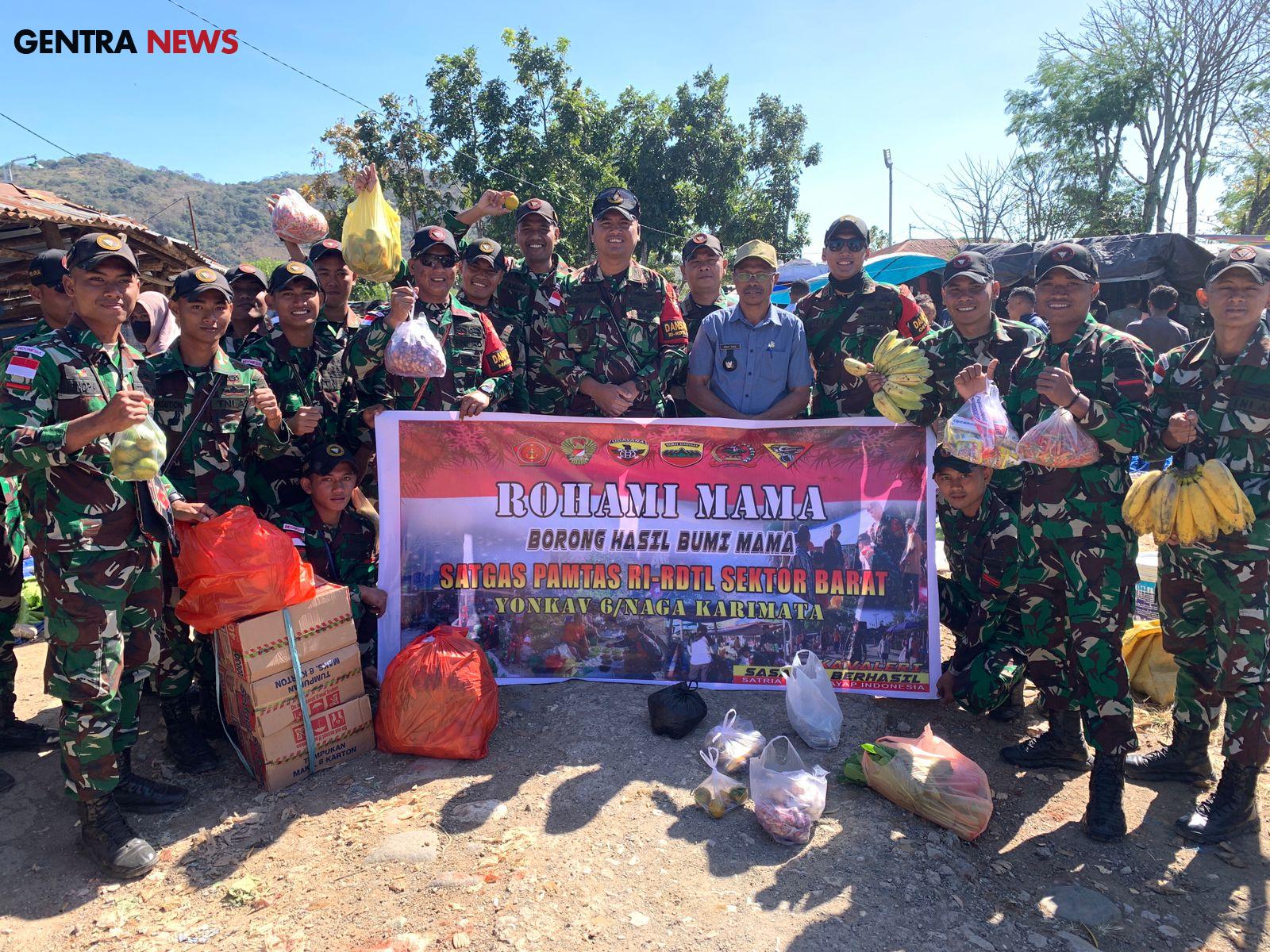 Kedatangan Dansatgas Yonkav 6/Naga Karimata beserta jajaran SSK I dalam memberikan berkah kepada Pedagang yang berjualan di daerah perbatasan dalam program Borong Hasil Bumi Mama (Rohami) yang dilaksanakan di Pasar Naekake.